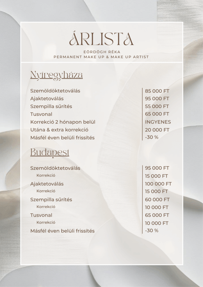 Eördögh Réka vagyok, professzionális sminktetováló és sminkes. Számomra a legfontosabb, hogy minden vendégem elégedetten távozzon, hiszen a szépségápolás nemcsak a külsőről szól, hanem az önbizalomról is. Munkámat szenvedéllyel végzem, és igyekszem minden egyes kezelést egyedivé és személyre szabottá tenni. Hiszem, hogy a természetesség a legszebb, és ezt próbálom megmutatni mindegy egyes vendégemnek.